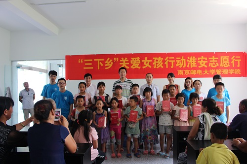 8月1日下午2时许,来自南京邮电大学的志愿者团队,在淮安市吴城镇河滩村村委会举行了以“邮青春,邮梦想”为主题的关爱女孩志愿者活动捐赠仪式暨暑期帮扶支教夏令营开营仪式。