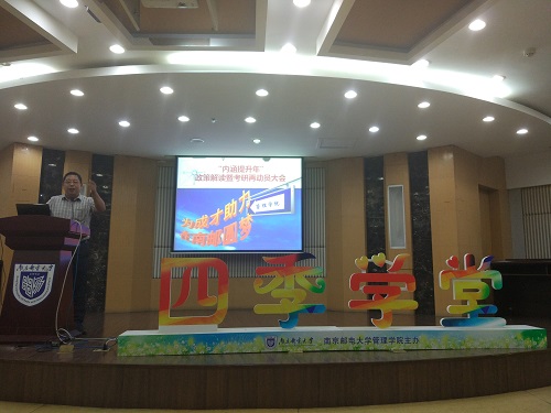 接着,邓书记上台为同学们做考研就业的再动员,回顾亲身经历,总结人生经验,将宝贵的建议毫无保留地传授给同学们,鼓励大胆去闯,勇敢去追,整个管院都是同学们坚强的后盾。