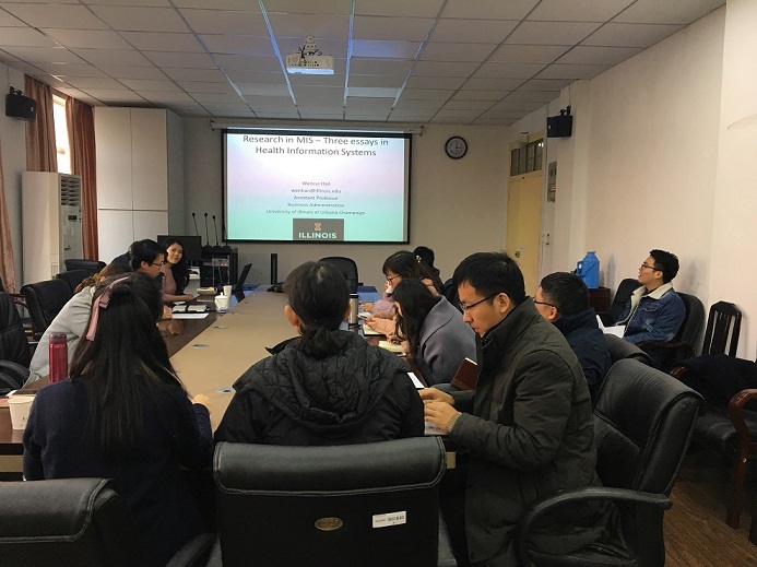 2017年12月19日,我校杰出校友、美国伊利诺伊州立大学香槟分校助理教授韩文萃博士应邀至我院为师生作题为“Three Essay in Health Information Systems Research”的讲座。讲座由院长助理周晓剑副教授主持,管院相关研究领域教师和学生参加了此次会议。