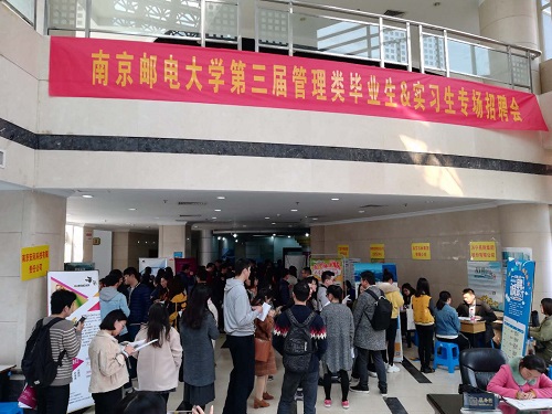 3月22日下午,由招生就业处主办,新葡的京集团35222vip承办的南京邮电大学第三届管理类专场招聘会在三牌楼校区科学会堂举行,400多名同学参加了招聘会,校招就处领导、新葡的京集团35222vip党委书记江森、副书记邓艳华以及毕业班辅导员到场了解参会同学的求职状况,并与招聘单位工作人员深入交流。