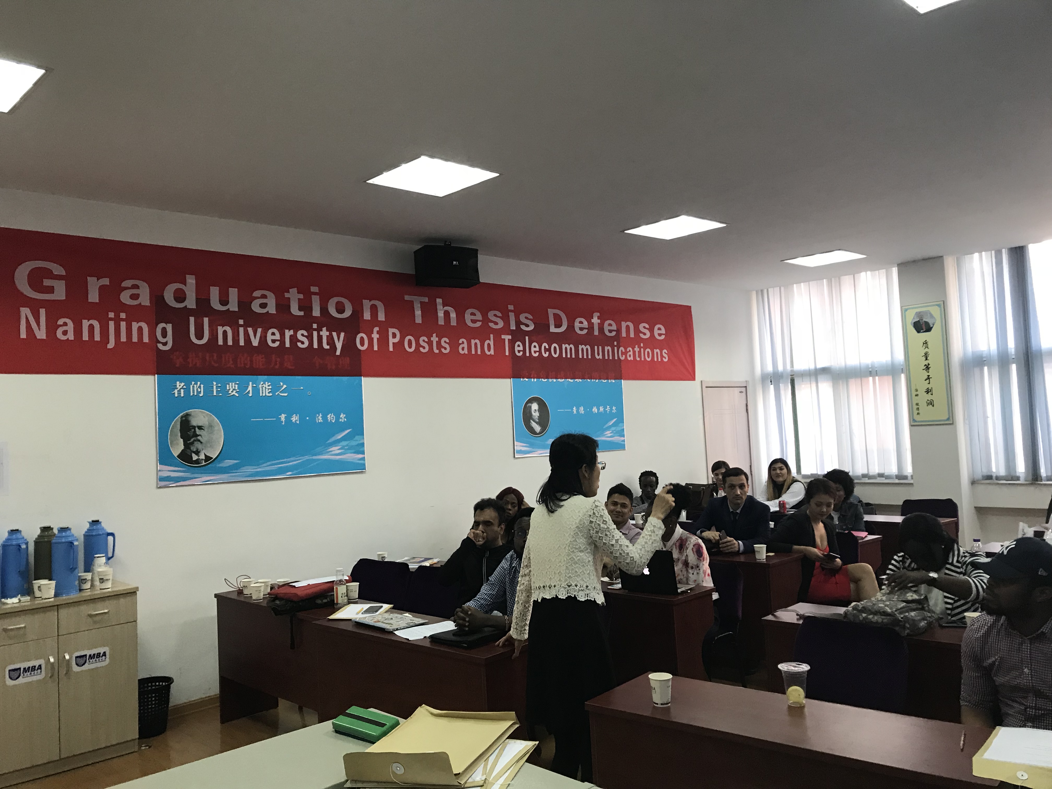 2018年4月2日,南京邮电大学2015级21名工商管理专业硕士留学生在三牌楼校区MBA教育中心分为2组进行了硕士论文答辩。第一组由河海大学唐震教授担任答辩主席,答辩组专家是南京航空航天大学的谢乃明教授和南京林业大学的杨加猛副教授,孙建敏老师担任秘书。第二组由南京信息工程大学的张慧明教授担任答辩主席,答辩组专家是南京审计大学的马少辉教授和南京大学的李娟副教授,林萍老师担任秘书。新葡的京集团35222vip院长助理张冲副教授全程负责了答辩工作专家邀请、海外学院同事对接、答辩现场协调等一系列工作。