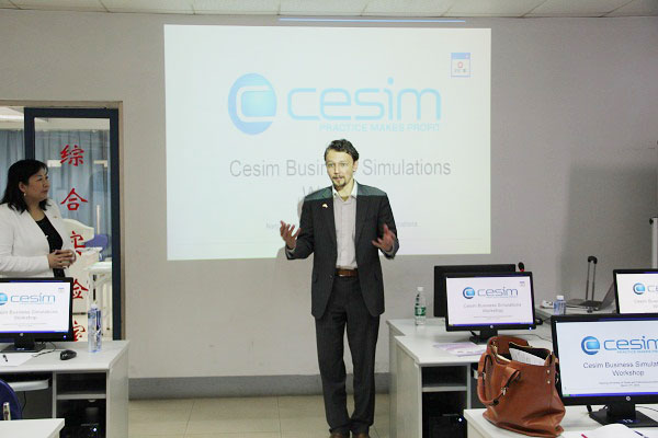 上午,由CESIM公司来自芬兰的Veijo Kyösti先生作为主讲人介绍了国外整体实战教学情况介绍,分享了国外创新创业教学课程实例、国内院校创新创业课程使用实例以及体验创新创业模拟、价值点等案例。下午,在Veijo Kyösti先生带领下,将与会教师和学生进行分组,让师生在CESIM公司的企业模拟台上进行实战演练。