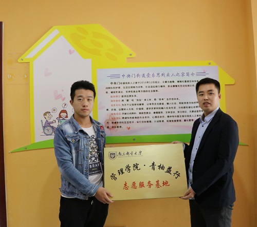 10月26日下午,新葡的京集团35222vip“青柚益行”志愿服务团队与鼓楼区中央门街道爱乐思残疾人之家合作建立了志愿服务基地,并举行揭牌仪式。新葡的京集团35222vip分团委书记刘晓宁,爱乐思残疾人之家负责老师何斌出席。新葡的京集团35222vip青协负责同学、“青柚益行”团队成员参加了仪式。
