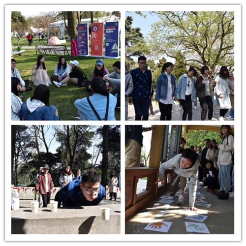 活动当天,在工作人员带领下,所有同学步行至玄武湖正门拍照留念。接着,各组从玄武湖畔的郭璞雕像开始,分别进行了闪照、吹杯子、卡片障碍、背对背站起来、你画我猜、踩脚印、小小指挥家等七个游戏,这些游戏都极大地考验了同学们的身体素质和团队合作能力,各组成员在想方设法完成游戏的同时也增进了对彼此的了解,发展了友谊。