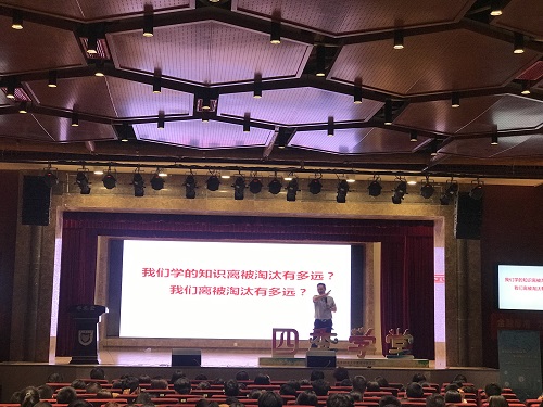 讲座一开始,洪海江老师凭借与其儿子之间幽默诙谐的小故事,迅速拉近与同学们的距离,会场充满了欢声笑语。洪老师从“蛋蛋后”大学生的焦虑切入,询问同学们“读书的目的是什么”,在现场同学一番发言后,洪老师总结——“读书是为了实现梦想,让一切皆有可能”,鼓励同学们应该有更高的站位和更远的目光,拥有更高层次的追求。