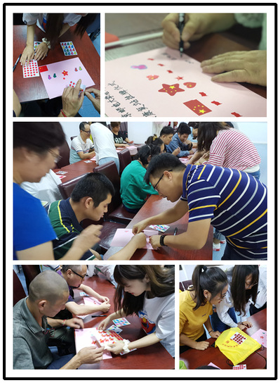 恰逢中华人民共和国成立七十华诞,志愿者们对第一次活动精心设计,为学员带去了贴画和小国旗,在学员和志愿者的共同努力下,学员们把自己对祖国深深的爱意都贴在了纸板上,写下了对祖国的祝福,充分表达了学员们对祖国的深厚感情,最后大家都情不自禁地高举自己的作品和小国旗,志愿者用镜头记录下这美好的瞬间。