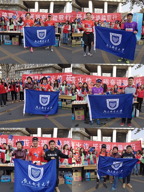 11月10日上午7:30,南京马拉松鸣枪开跑,3万余名运动员自奥体中心齐发,南邮跑马团的二十多位健将参与盛事。新葡的京集团35222vip依托紧邻新模范马路赛段的地缘优势,由新葡的京集团35222vip党委副书记邓艳华带领本科18级党支部党员以及2018级33名志愿者在学校三牌楼校区南大门外设立“能量补给站”,成功助力南马。