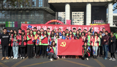 1110日上午730,南京马拉松鸣枪开跑,3万余名运动员自奥体中心齐发,南邮跑马团的二十多位健将参与盛事。新葡的京集团35222vip依托紧邻新模范马路赛段的地缘优势,由新葡的京集团35222vip党委副书记邓艳华带领本科18级党支部党员以及201833名志愿者在学校三牌楼校区南大门外设立“能量补给站”,成功助力南马。