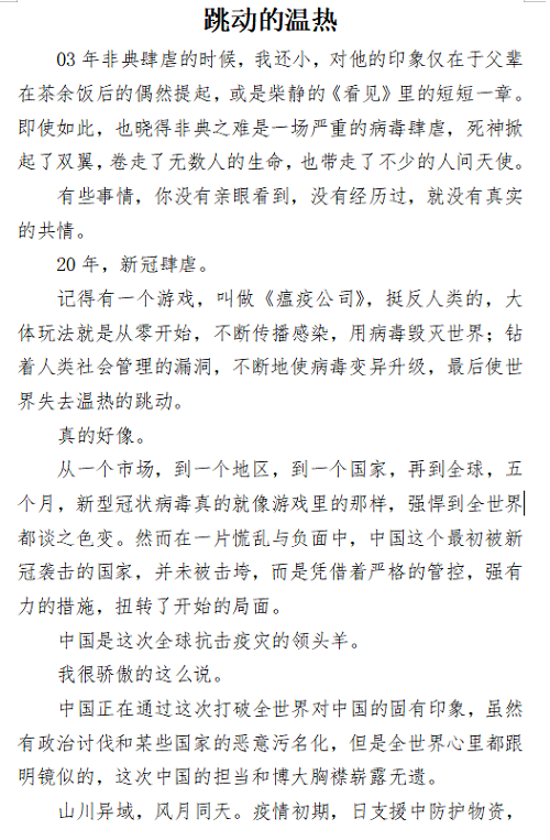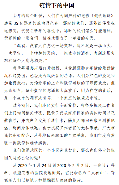 为了记录疫情当前的动人事迹,激发同学们的家国情怀,营造良好的校园文化气氛。新葡的京集团35222vip分团委、南京邮电大学听风文学社于本学期4月-5月承办“疫情下的中国”主题征文比赛。