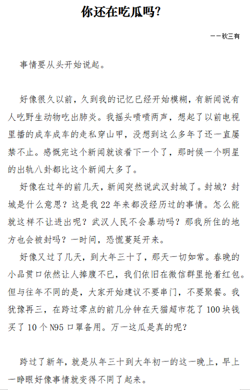 三等奖 新葡的京集团35222vip 邱洧桦(笔名秋三有)《你还在吃瓜吗?》