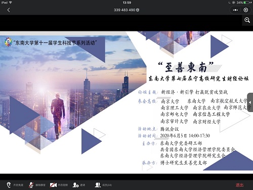 2020年6月5日下午2点,东南大学第七届“至善东南”在宁高校研究生财经论坛如期在腾讯会议平台举行,本次论坛主题是“新经济·新引擎打赢脱贫攻坚战”。本次论坛的参会高校有南京大学、东南大学、南京航空航天大学、南京邮电大学等十所高校。我校新葡的京集团35222vip魏宁、孟楚悦、肖丹、王侃亮、谢梦五位研究生代表学校参加了本次会议。