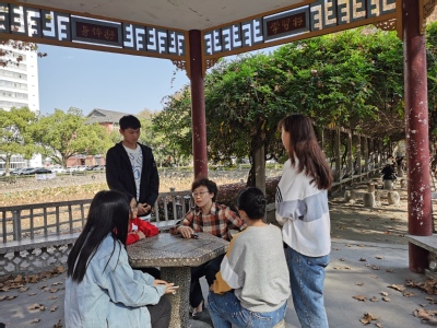 11月15日上午9:10,活动成员们驱步至三好亭。朱清书记首先为大家简要介绍了南邮校史,七十八年的办学历史正是南邮人最宝贵的精神财富,同学们有责任有义务将其继续传承发扬。讲话结束,同学们聚集在紫藤廊下,分组进行传唱。从第一句“齐鲁烽火,战邮发祥”到“南邮之路,鼎新永续辉煌”,同学们追溯了南邮的红色校史,重温了壮烈的烽火岁月,彼时同学们的爱校情结与归属感油然而生。传唱环节结束后,全体同学立于三好亭下,再次合唱校歌。