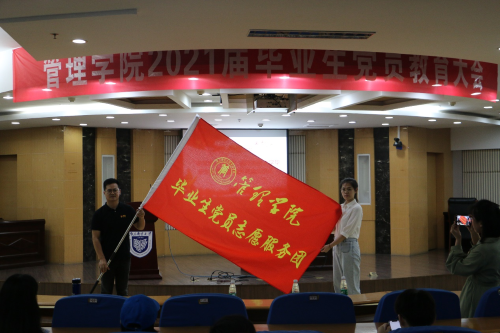 伴随着庄严的国歌,大会拉开了序幕。会议首先进行了“学党史·办实事”南京邮电大学毕业生党员志愿服务月启动仪式,组建“毕业生党员志愿服务团”,本科2017级党支部组织委员祁雨秋担任团长,支部全体党员(含预备党员)担任团员。新葡的京集团35222vip党委书记钟凯为“毕业生党员志愿服务团”团长祁雨秋同学授旗。