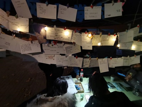 活动开始前,听风文学社的同学们热情高涨,整理外场,积极宣传。活动现场,路过的同学们纷纷停下脚步,被一张张写着寄语的明信片吸引,争相参加活动。新葡的京集团35222vip院长黄卫东教授,新葡的京集团35222vip党委副书记、副院长郭强老师及退休教师们也在明信片上寄语了对学院发展的期许和美好祝愿。参与的同学们在卡片上写下自己的寄语,并夹在绳子上,同时又能够取走一张自己感兴趣的明信片。虽然天气寒冷,但是同学们的热情不减,丝毫不显倦怠。一张张明信片的夹上和摘下,足够体现出同学们的热情,也让这寒冷的冬天多出一丝暖意,给三牌楼增添了一股文学气息。