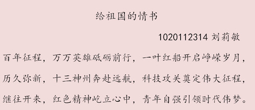 本次活动主要面向新葡的京集团35222vip研究生,旨在以简练精致的“三行情书”的形式,表达对祖国母亲的热爱,对家人的牵挂,对情侣的告白、朋友的祝福以及对往事的追忆。此次活动得到了研究生们的一致好评,各级研究生们积极投稿、踊跃参与。大家用寥寥数语,三行文字来表达内心的情感,展现心中的悸动。