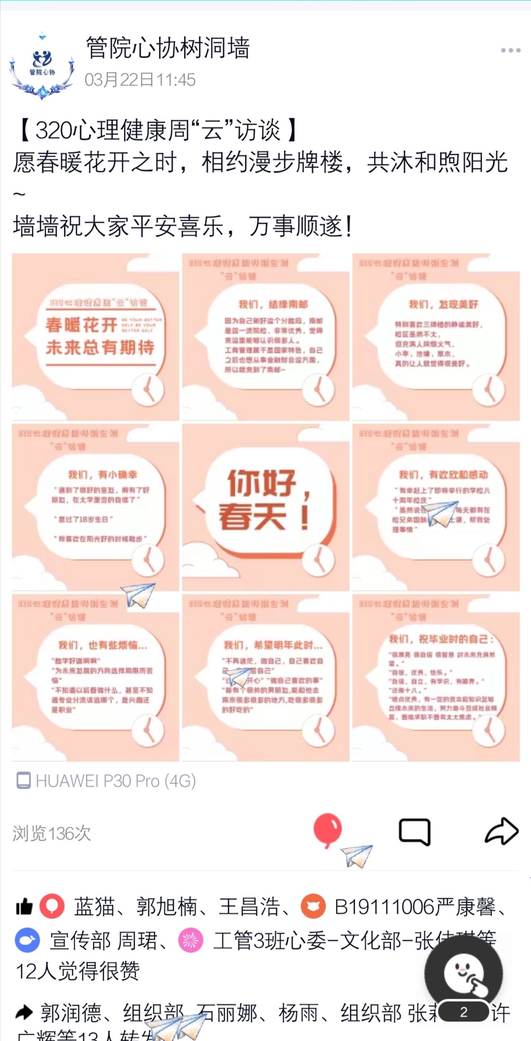 本次活动得到了2021级新生的广泛响应与积极参与。各位心协成员做好充分准备,深入同学群体征集调查,旨在了解大一同学们步入大学以来的感受、思考与困惑。在帮助同学们排解烦恼之后,心协成员在一封封感情真挚的稿件中选用具有代表性的词句,以暖色系为主色调、融入春日里美丽的风景,最终制作成“云访谈”的图片发布在树洞QQ平台。