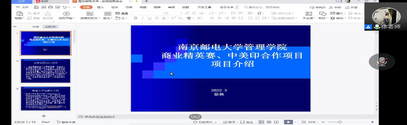 3月30日晚上7时,新葡的京集团35222vip举办了商业精英赛(中美印合作项目)线上宣讲会。我院徐侠老师、吴鸣然老师,2020、2021级全体辅导员及全体本科生参加此次宣讲会。