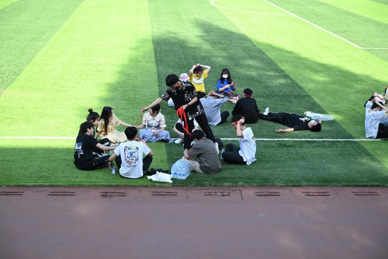 各班级活动形式多样,有扔沙包、掷手绢、踩气球等趣味活动,比赛过程中,同学们努力拼搏,全力以赴,既有趣又激烈,既赛出风采又凝聚情谊。尤其是踩气球活动,既考验队员之间的巧妙配合,又考验个人耐力和体力。场外同学呐喊声此起彼伏,现场氛围热烈,和谐有序,整个活动伴随着欢声笑语,其乐融融,操场成为欢乐的海洋。在激烈的比赛过后,同学们围坐一团,互相交谈,分享美食,进行一些如狼人杀等卡牌游戏,部分班主任、辅导员也加入其中,与同学们促膝而谈,和同学们分享校园生活趣事、进行趣味小游戏。此外,傍晚时分,同学们还准备了“广场舞”等娱乐活动,各班同学们在音律的节拍下,跳起了舞蹈。同学们之间的感情在这期间也越发紧密深厚。