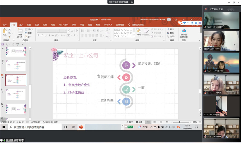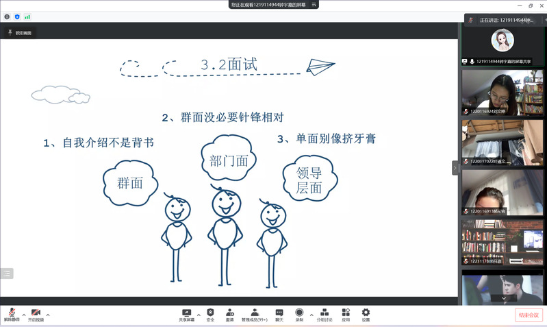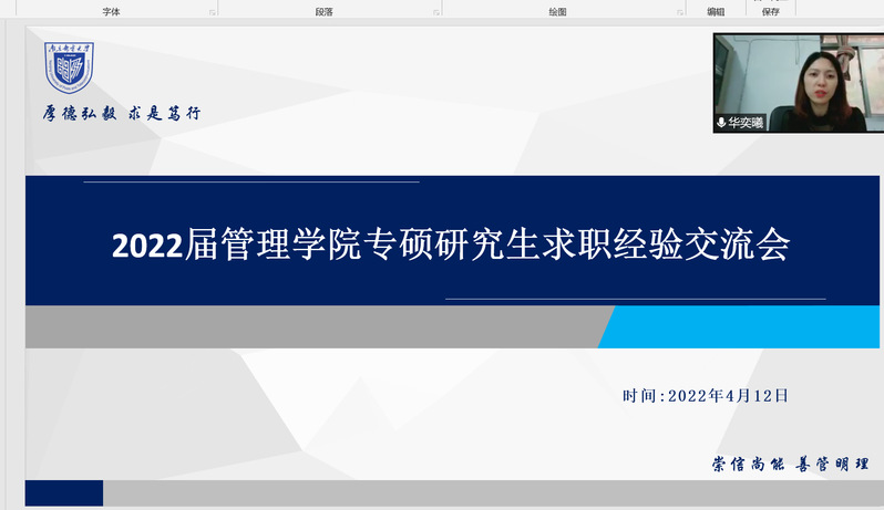 以经验为马,以汗水为泉。4月12日下午,“新葡的京集团35222vip会计专硕求职经验分享会”在腾讯会议APP上如期举行。本次活动由新葡的京集团35222vip研究生会承办,邀请了新葡的京集团35222vip研究生辅导员华奕曦老师作为与会嘉宾和四位在求职就业方面有代表性的研三同学作为主讲人,为新葡的京集团35222vip研一、研二的会计专硕研究生们分享他们在求职工作中的宝贵经验。