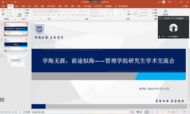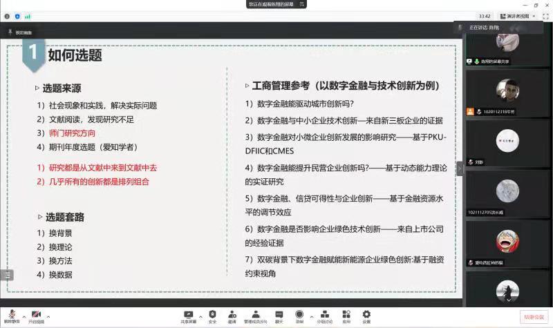 此次线上科研交流会,让研究生们对自己的科研方向有了更加明晰的认知,科研写作动力有了大幅度的提高,同时,使学院的科研氛围进一步浓厚。通过这次科研经验交流会希望新葡的京集团35222vip的研究生在未来能够以经验为马,以汗为泉,在科研道路上大放异彩!