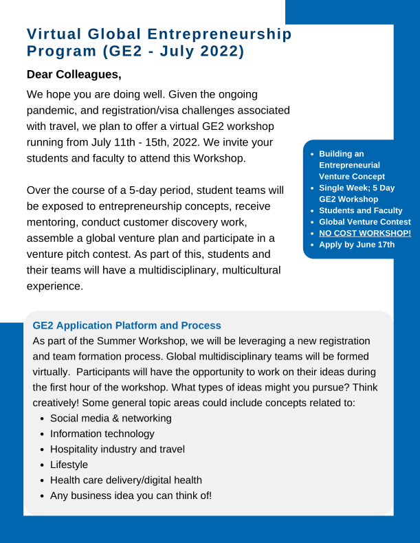 Given challenges associated with holding in-person programs and building on the success of previous virtual GE2 workshops, we are pleased to announce that we will again offer a no-cost virtual GE2 program in the Summer of 2022.