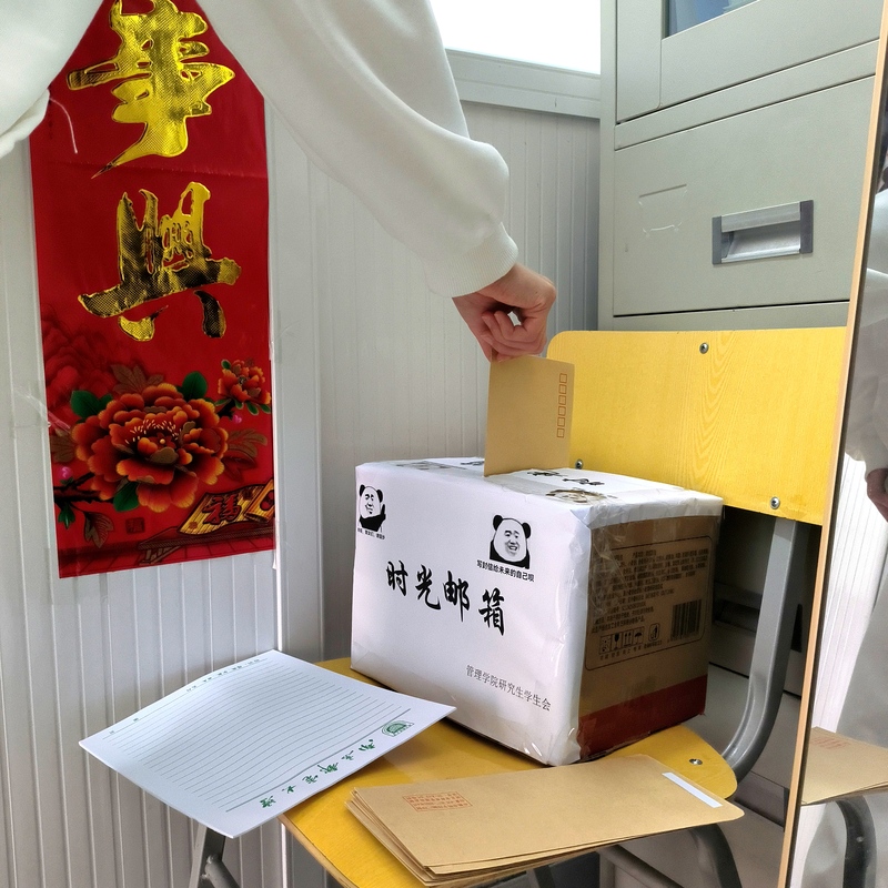 管院研究生会在有线楼各教研室门口处放置了空信封和南邮信纸,鼓励研究生们前往领取,给未来的自己寄封信。活动期间,研究生们积极参与,认真撰写书信,思考着自己的成长目标,与未来的自己进行心灵对话。“时光邮筒”的再次开放时间为2022年12月25日(圣诞节),届时新葡的京集团35222vip研究生会会将保存的信件返还给对应的同学。