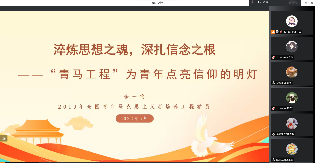 6月2日,新葡的京集团35222vip菁英人才学校培训班第四次课程通过腾讯会议平台顺利进行。本次课程邀请了新葡的京集团35222vip辅导员、本科2021级党支部书记、2019年全国青年马克思主义者培养工程学员李一鸣老师,为广大学员带来以“淬炼思想之魂,深扎信念之根——‘青马工程’为青年点亮信仰的明灯”为主题的讲座。
