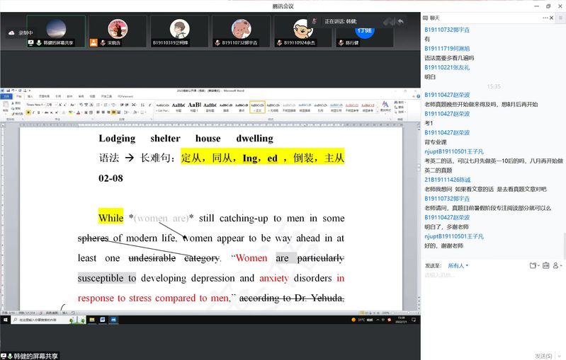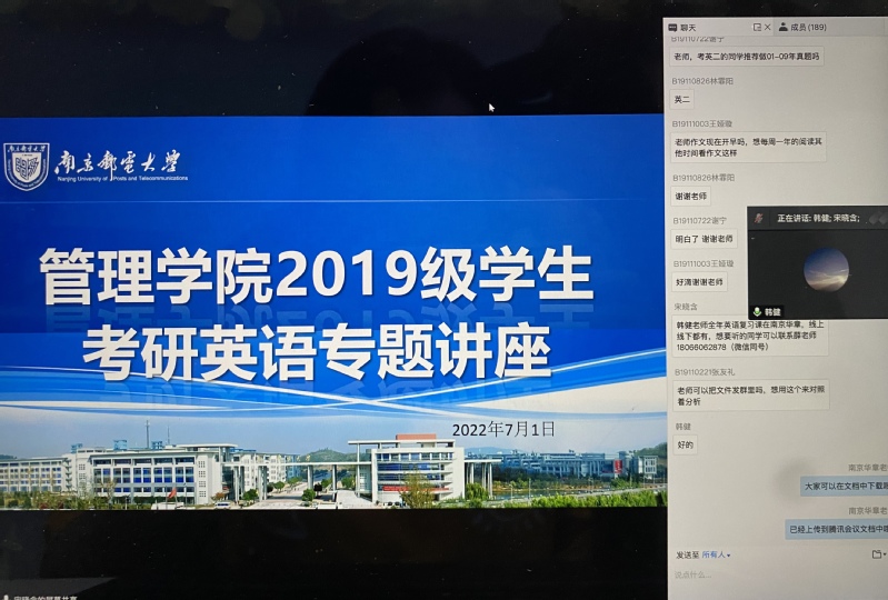 为帮助2019级考研同学掌握考研英语答题技巧,提高复习效率,根据学院暑期线上“云考研”帮扶实施方案,2022年7月1日下午,我院邀请上海外国语大学英语语言文学博士韩健老师为2019级考研同学带来题为《考研阅读理解——如何读文章》的线上专题讲座。新葡的京集团35222vip党委副书记、副院长郭强出席活动并作动员讲话,2019级全体考研同学参加。本次讲座由2019级辅导员宋晓含老师主持。