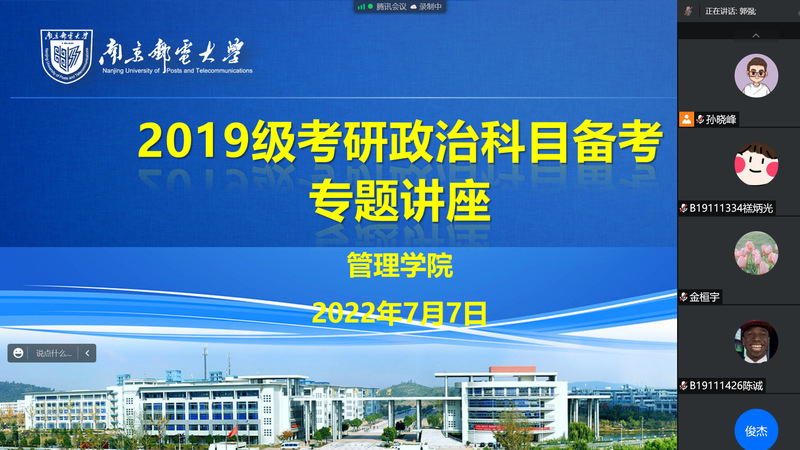 为帮助同学厘清政治考研框架,完善政治复习规划,增强考研信心,7月7日晚,我院邀请财鑫教育考试研究中心考研政治金牌名师金桓宇为2019级考研同学带来政治科目备考的线上专题讲座,讲座由新葡的京集团35222vip党委副书记、副院长郭强主持,2019级全体考研同学参加。