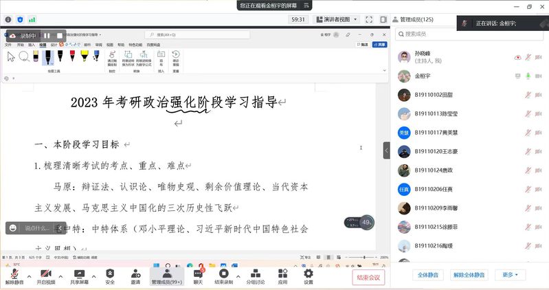 金老师从考研政治的备考规划和复习策略两方面入手,首先从马克思主义原理、毛泽东思想和中国特色社会主义理论体系概论、中国近现代史纲要和思想道德修养与法律基础四个板块梳理了考研政治的重点难点,内容删繁就简,提纲挈领。她提出考研政治的学习,不能流于简单的死记硬背,要不断重复和书写各类重要知识点。随后,对于政治科目的学习方法,金老师提出3点建议:1,地毯式学习,做到没有死角;2,及时梳理知识点,但不要盲目照搬照抄;3,对于不懂的问题及时沟通。最后,金老师通过幽默风趣的语言,回答了同学们关于做题方式、教材选取、知识记忆等几个方面的疑问。