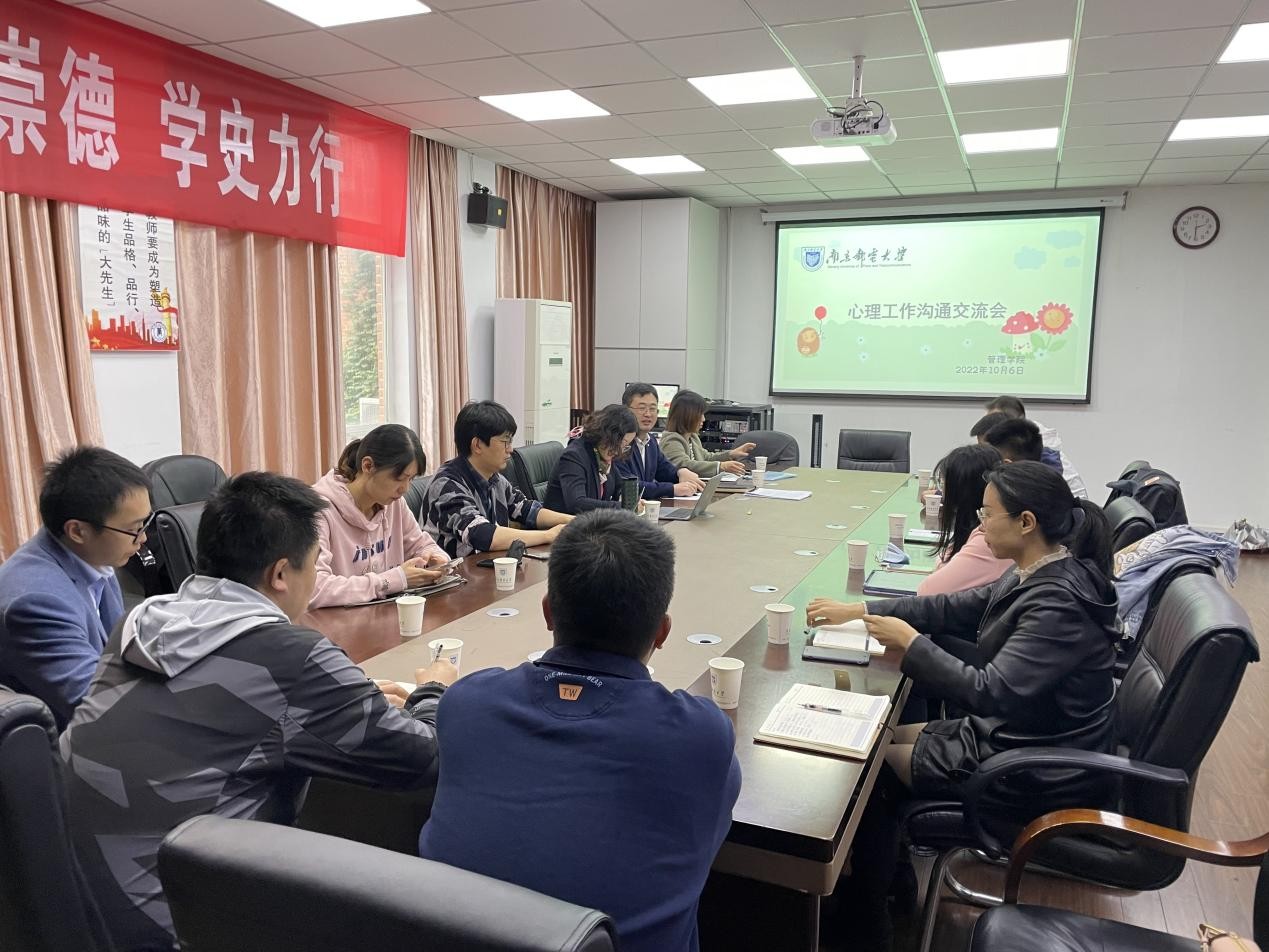 为进一步做好大学生心理健康教育工作,引导大学生健康成长,提高开展大学生心理健康教育工作的能力和水平,10月6日下午,新葡的京集团35222vip邀请学校学工处副处长、心理健康教育与咨询中心主任陆晓花,心理健康教育与咨询中心专职心理咨询师张秀敏老师、成颢老师,与学院党委副书记、副院长郭强、全体在校辅导员一起围绕学生心理工作问题进行了沟通交流。