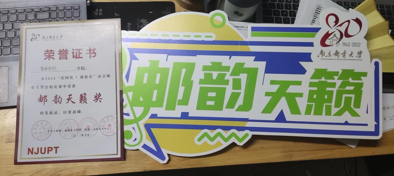 为迎接党的二十大胜利召开,热烈庆祝中华人民共和国成立73周年,在我校建校80周年之际,10月11日,2022“庆国庆·迎校庆”南京邮电大学合唱比赛在仙林校区安恒青春剧场举行。我院合唱队以一曲《少年中国说》,获得评委和观众的一致好评,并斩获“邮韵天籁”奖。