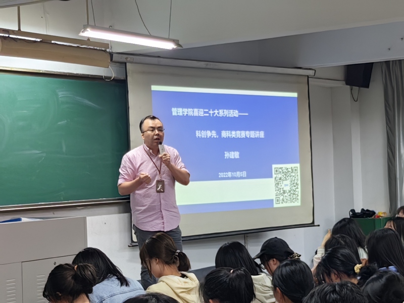 10月5日晚,新葡的京集团35222vip在三牌楼校区无线楼举行“喜迎二十大系列活动”——科创争先,商科类竞赛专题讲座,特邀南京邮电大学MBA中心孙建敏老师为同学们带来市场调研大赛、电子商务大赛等商科类竞赛的指导分享。学院各个年级200余名同学聆听了讲座。
