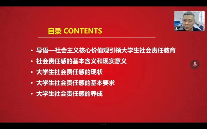 江森老师以《以社会主义核心价值观为引领,增强大学生社会责任感》为题,结合党的二十大报告,先后讲述了社会责任感的基本含义和现实意义,以及大学生社会责任感的现状、基本要求与养成的五个方面;讲述了疫情防控与脱贫攻坚这两场“没有硝烟的战争”。江老师要求学员们自觉践行社会主义核心价值观,贯彻党的二十大精神,不断提高社会责任认知、认同、行动,完善人格,珍惜生命,学会对国家、对社会负责。同时希望学员们增强社会责任感并做到知行合一,严格要求自己,将入党的意愿化作实际行动,积极发挥先锋模范作用,成为有理想有本领有担当的时代新人。