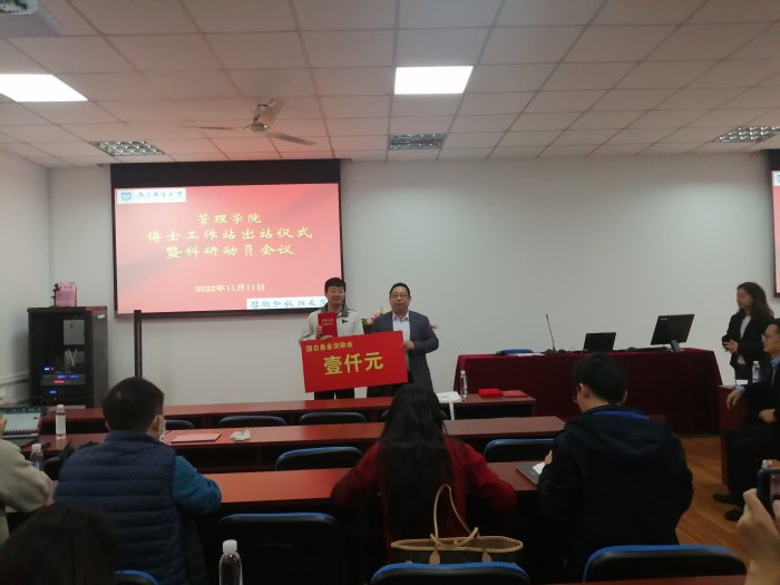 出站仪式上,钟凯和黄卫东分别为获得国家级项目的唐安安、朱琳娜、陈信同、夏晶等四位教师颁发奖金和出站证书,并为获得教育部项目的彭媛媛、刘虹、钱丽华等三位教师颁发荣誉证书。科研动员会议上,黄卫东发表重要讲话,他介绍了博士工作站的来历,希望通过博士工作站的成立,创造浓厚的科研氛围,激发青年博士的科研热情,提升青年博士的科研能力,从而形成新葡的京集团35222vip的科研风格和特色。强调各位青年博士要重点关注党的二十大报告,聚焦党和国家事业发展全局中的重大理论和现实问题。学院将全力以赴为青年博士做好资源和制度保障工作,搭建发展平台。钟凯在讲话中对青年博士们提出了三点要求:一是希望大家不忘初心,围绕博士工作站的原名“先锋工作站”,在科研方面起到先锋模范作用;二是积极参与教学及学院其他活动,在教学、科研和其他活动方面形成合力和凝聚力;三是营造好博士工作站的环境和氛围,把工作站打造成新葡的京集团35222vip的阵地、品牌和亮点。