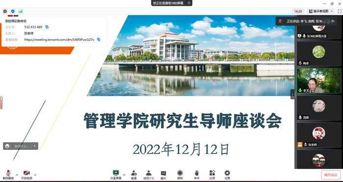 2022年12月12日,新葡的京集团35222vip组织召开研究生导师线上座谈会。会议由学院党委书记钟凯主持,学校督导组专家曹伟、研究生院常务副院长李飞、现代邮政学院副院长高辉、学院副院长张冲、学院研究生导师代表及工作人员参加了本次会议。