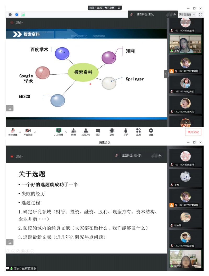 为进一步提升新葡的京集团35222vip会计专业研究生论文写作能力,营造浓厚的学术氛围,让研究生了解论文写作的规范性,拓宽学术研究思路,12月9日晚,我院邀请王为老师和吴兴宇老师为会计专业研究生带来论文指导专题讲座,本次讲座通过腾讯会议以线上交流方式举行,我院会计专业全体研究生参加。