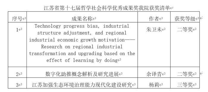 近日,江苏省哲学社会科学优秀成果评奖委员会发布了省第十七届哲学社会科学优秀成果评奖结果公告。本届评选出获奖成果750项,其中一等奖120项、二等奖300项、三等奖330项。我院朱卫未教授的成果获得二等奖,余译青博士的成果获得二等奖,杨莉教授的成果获得三等奖。