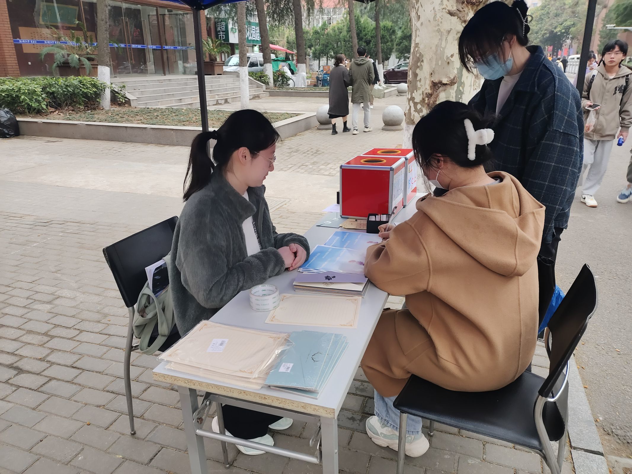 3月20日,活动如期举办,本次活动主要包括“交换心情”、“时光邮局”、“图绘我心”以及“心理问卷与心理小测试”线上线下相结合共四个活动。在活动现场,值班的心协成员为感兴趣的同学耐心认真的讲解各个活动的参与方法,虽然说天气寒冷,春雨纷飞,但是新颖的活动形式以及经过前期在各班级群、QQ空间以及朋友圈的大力宣传之下,活动还是吸引了不少同学热情地参与到了其中。同学们对此次活动的支持和热情也让心协的各位成员在春分之际感受到了三牌楼同学们犹如春雨般“润物细无声”的温暖。