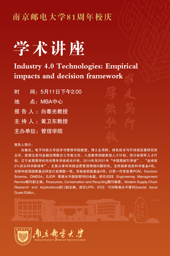 专家讲座:Industry 4.0 Technologies: Empirical impacts and decision framework