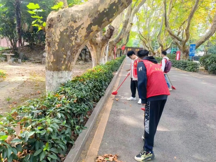 无线楼前的篮球场凉爽又温暖,志愿者们身穿红马甲,手拿各自携带的打扫工具,在分配好任务后,便开始了井然有序的清扫工作。秋风飒飒,片片梧桐树叶落下,渐显萧瑟,但志愿者们的热情却丝毫不减。他们手持扫帚簸箕,高效地将眼镜湖、篮球场、行政南楼及其周边清扫干净。