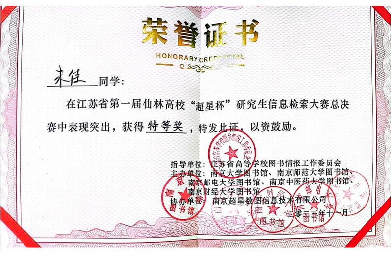 11月10日,由江苏省高校图书情报工作委员会指导,南京大学、南京师范大学、南京邮电大学、南京中医药大学、南京财经大学五所高校图书馆共同主办,南京大学图书馆承办的江苏省第二届仙林高校“超星杯”研究生信息检索大赛总决赛举行。我院2022级研究生钮茜琦、朱佳代表学校参赛斩获特等奖。