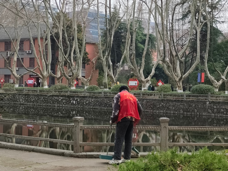 在分配好各自的任务后,同学们于三牌楼校区眼镜湖旁、篮球场、行政南楼周围以及假山周围等进行卫生打扫活动。志愿者们穿梭于校园的每个角落,身披鲜艳的红马甲,手持扫帚簸箕,分工明确,相互合作,高效迅速地完成了清扫任务。