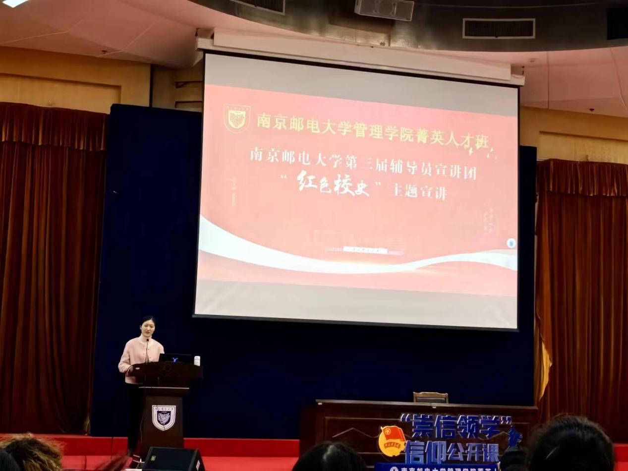 为深入学习和弘扬党的光荣传统,理解党的初心和使命,赓续红色血脉,坚定理想信念,进一步激发学生爱党爱国爱社会主义和爱校荣校热情,4月19日,我校第三届辅导员宣讲团“红色校史”主题宣讲活动走进新葡的京集团35222vip。校第三届辅导员宣讲团成员、新葡的京集团35222vip分团委书记鲍捷老师主讲。南京邮电大学第190期菁英人才学员参加活动。