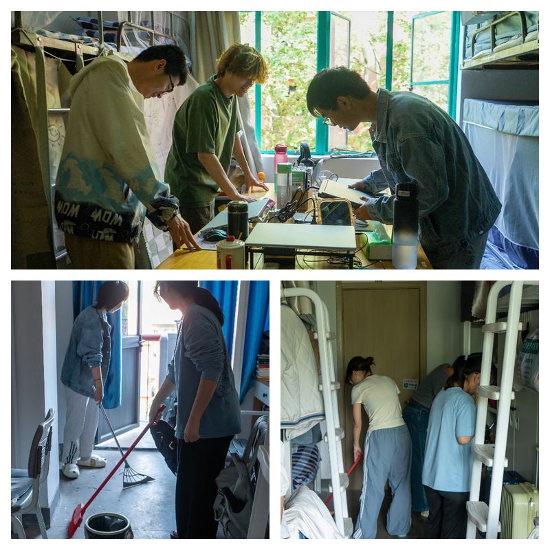 随后,同学们结合所学经验返回宿舍进行打扫,收纳杂物,整理衣物,铺平床褥,清理窗台,美化环境,齐心协力,各司其职。经过同学们的协同合做,宿舍窗明几净,春风拂过,焕然一新。