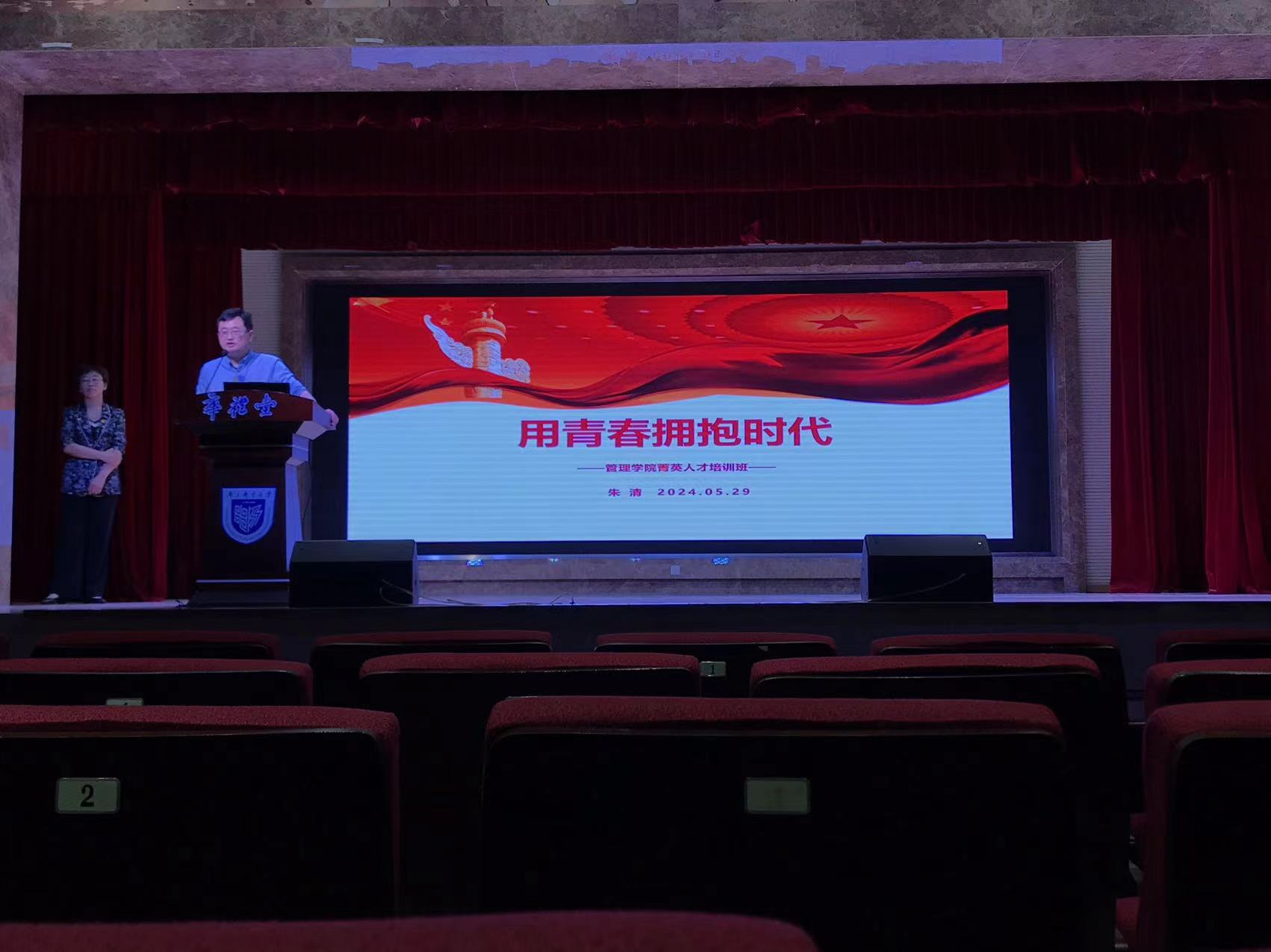 为明晰当代青年历史使命、重温百年复兴历程,用党的精神谱系汲取青春力量,5月22日下午,新葡的京集团35222vip于华礼堂举办“用青春拥抱时代”青马工程讲座,新葡的京集团35222vip原党委书记、校关工委讲师团成员、“江苏省优秀党务工作者”朱清教授主讲,第190期菁英人才班成员参加,新葡的京集团35222vip党委副书记、副院长郭强主持讲座。