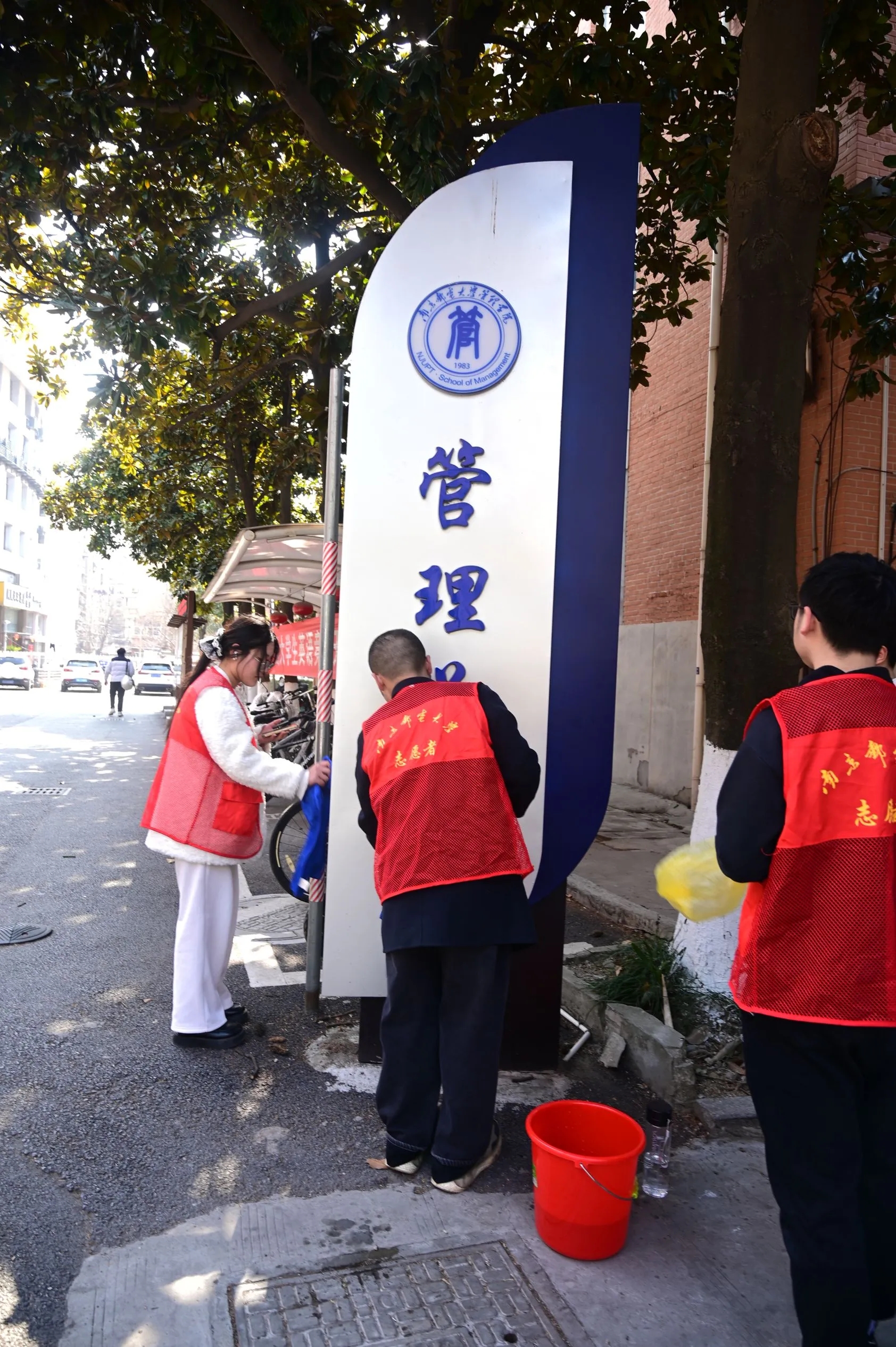 在午后的阳光下,志愿者们身着红色马甲,手持清洁工具,热情高涨地投入到校园美化工作中。从眼镜湖前的林荫大道,到教学楼间的花坛绿地,再到篮球场周边的休息区,处处可见他们忙碌的身影。他们认真清扫落叶,仔细擦拭公共设施,不放过任何一个卫生死角。在劳动过程中,志愿者们相互配合,默契十足,用实际行动诠释了“奉献、友爱、互助、进步”的志愿服务精神。