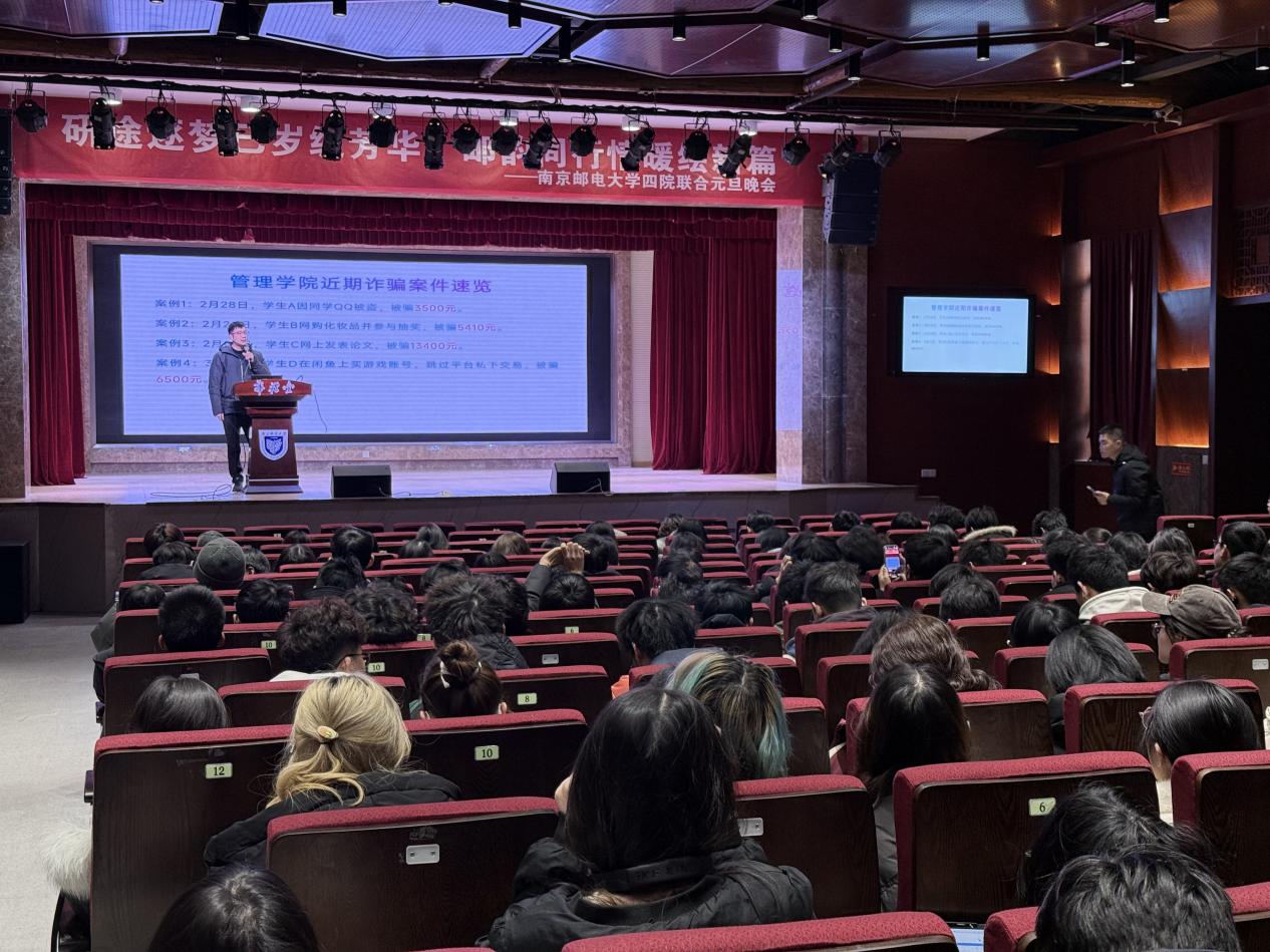 为增强学生防范诈骗意识,筑牢校园安全防线,2025年3月5日下午,新葡的京集团35222vip在华礼堂举行“筑牢反诈防线,共建平安南邮”主题宣讲会。会议由新葡的京集团35222vip2024级辅导员闾越老师主持,校保卫处刘庆宵老师主讲,学院2024级全体学生参加。