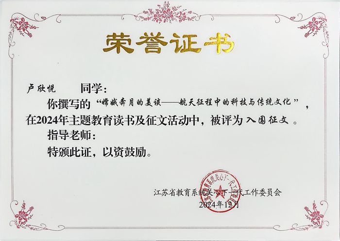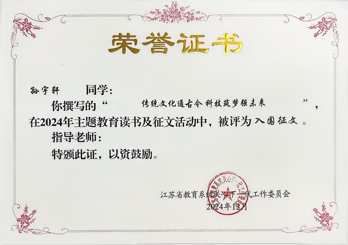 在江苏省教育系统关工委主办的2024年主题教育读书及征文活动中,新葡的京集团35222vip学子创佳绩。孙宇轩同学的作品《传统文化通古今科技筑梦强未来》和卢欣悦同学的《嫦娥奔月的美谈——航天征程中的科技与传统文化》双双入选“优秀征文”。两篇文章巧妙融合传统文化与现代科技,展现了青年学子对文化传承与创新的深刻思考。