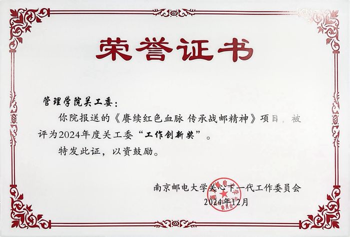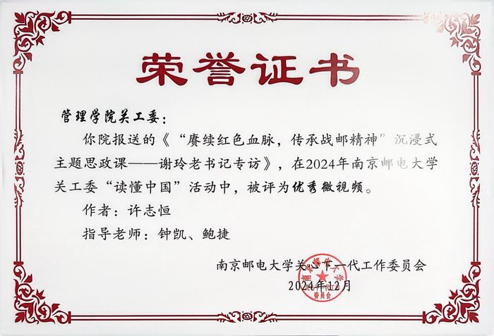 2024年南京邮电大学关工委“读懂中国”活动中,新葡的京集团35222vip关工委报送的沉浸式主题思政课《“赓续红色血脉,传承战邮精神”——谢玲老书记专访》荣获“优秀微视频”称号。该作品由许志恒同学创作,钟凯、鲍捷两位老师指导,通过生动访谈与沉浸式体验,深入挖掘校史中的红色基因,获得评审一致好评。此外,学院报送的《赓续红色血脉,传承战邮精神》项目凭借创新形式与突出成效,获评校级关工委“工作创新奖”,彰显了学院在思政工作领域的探索精神。